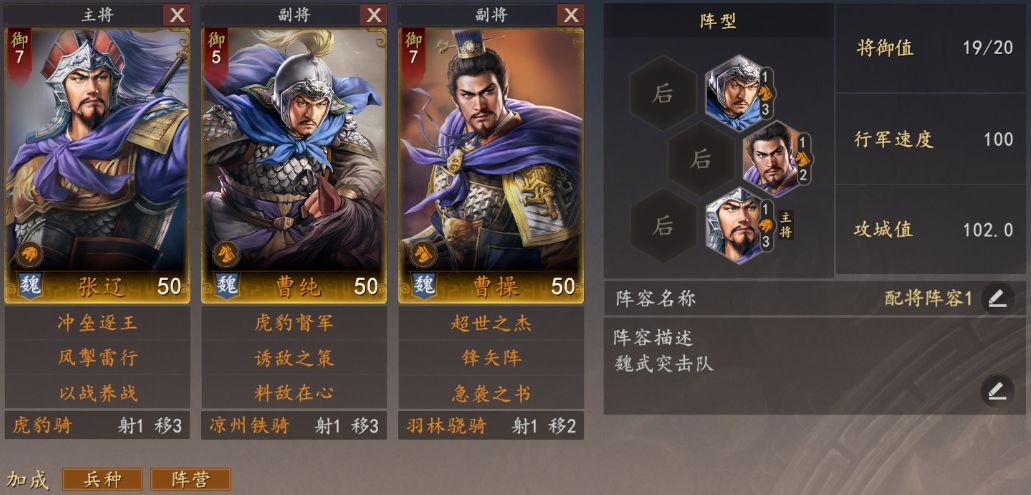 任何队伍都有其的长处也有缺陷不足,阵容组成的核心就是放大武将的特色机制或者说是优势长处。值得一提的是可以适当给阵容中的曹操和曹纯加一些速度,可以尽量先触发各种伤害加成效果,然后张辽就可以冲突敌阵中乱杀,理想中的画面是张辽两个回合就将敌方主将斩于马下,但是比较依赖站位和战法发动次数,以及是否被控制等。