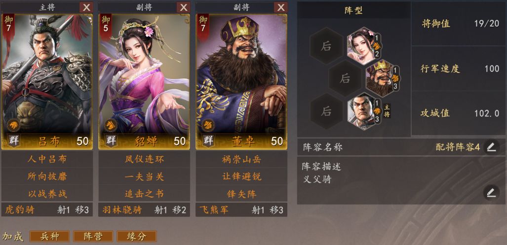 主将吕布+副将董卓+副将貂蝉