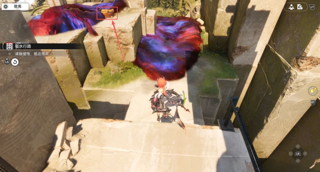 ·三个宝箱的位置分别在第一次上滑索位置的附近(图4)、主路途中的小山坡上(图5,需要先清理侵蚀)、以及最后一扇门前的左侧方向(图6,旁边还有侵蚀核心)