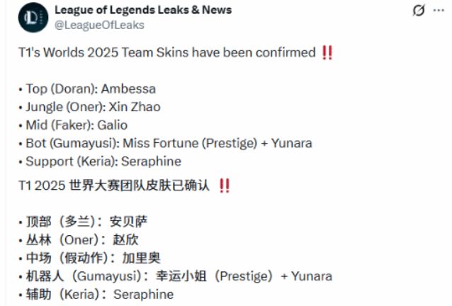 近日,海外LOL爆料博主 @LeagueOfLeaks 放出2025年T1世界冠军皮肤人选传闻,Faker或将选择加里奥引发热议。