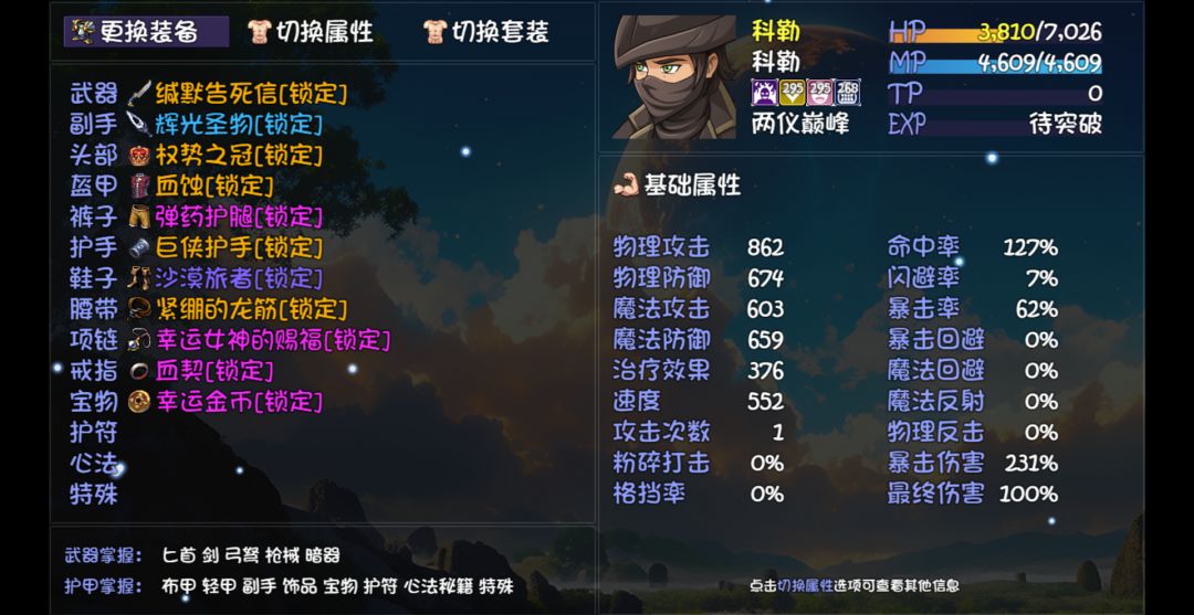 我的配置以掉宝率为前提,福源心法和沙漠鞋子这俩加成少的看情况取舍,本来我是掉率一套,王都一套,然后来回换感觉很麻烦而且有的时候会忘了换,所以最后我改成这个配置,刷深渊和王都都是用的这个配置。