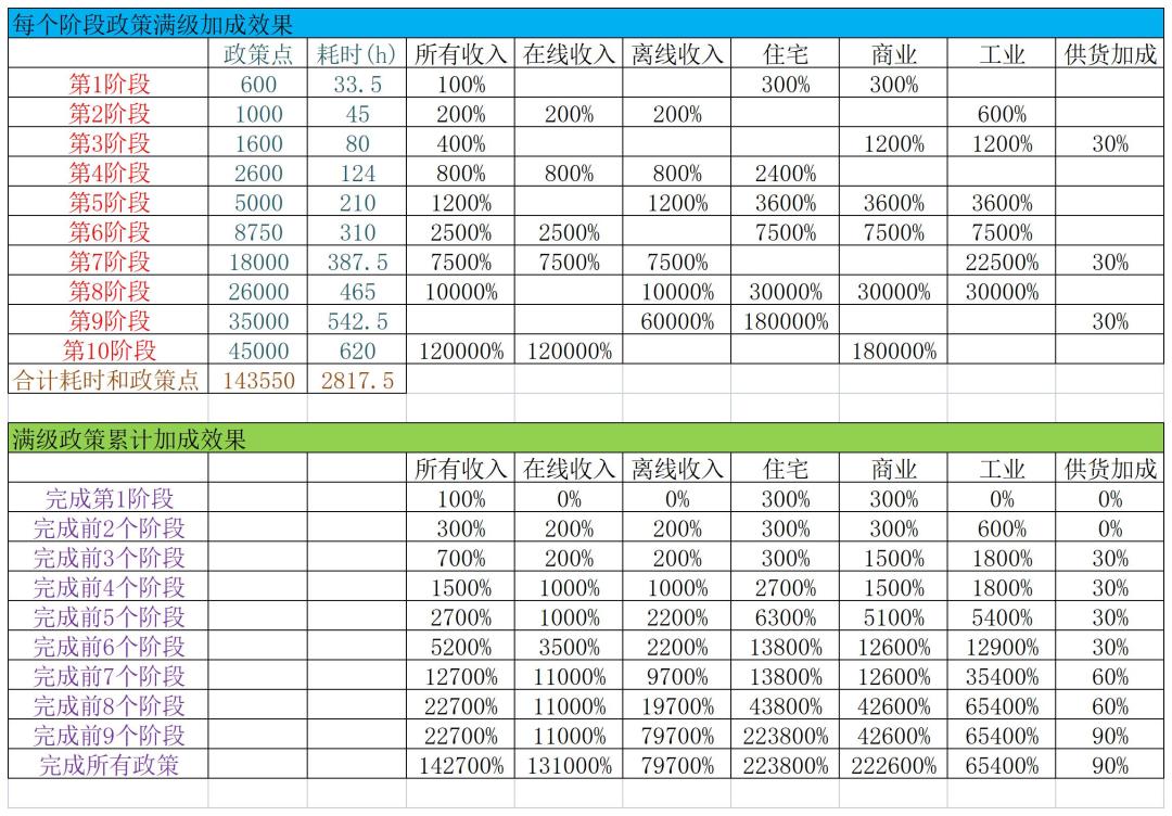 尤其是政策在不同阶段的加成不是同步的,所以游戏前期和中期一定要根据政策升级情况,适时调整自己的建筑组合(政策10阶以后,住宅≈商业>工业,所以影响比较大)