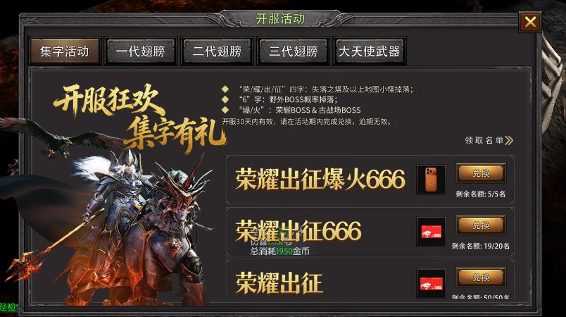 - 集字赢豪礼:开服首月挑战首领、打怪掉落 “荣、耀、出、征、爆、火、6” 字牌,集齐指定组合可兑换二代 / 三代翅膀、大天使武器等珍稀道具,更有机会抽取京东卡与实物大奖;