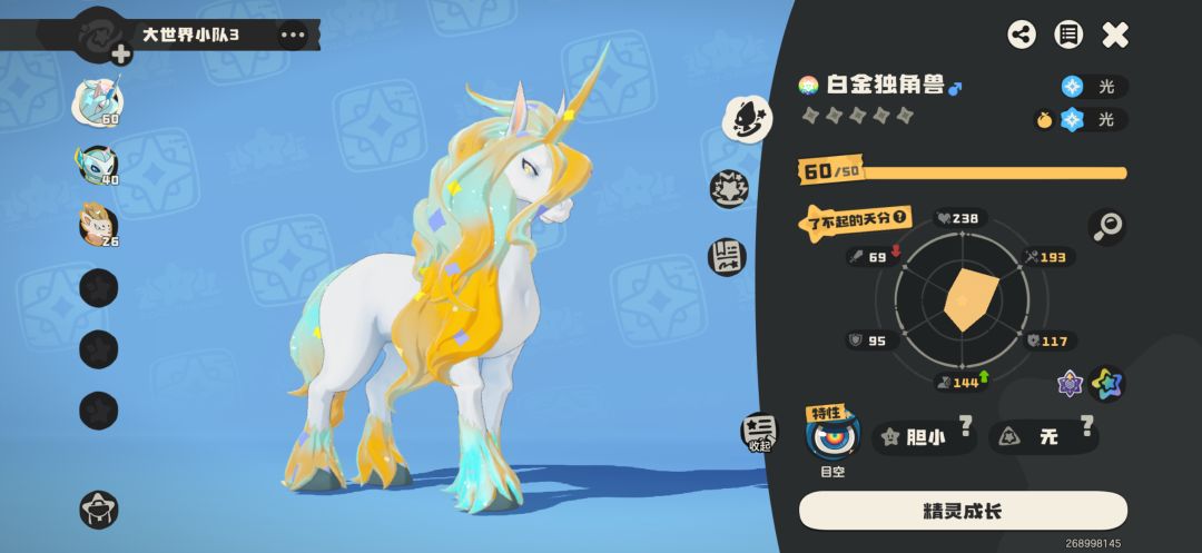 还有大家要养独角兽一定要到40级了打命定花种的独角兽,这个的天份,给的三围,性格都是最好的!