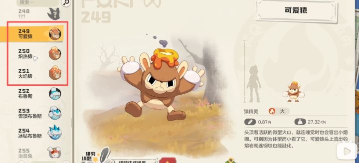 可爱猿28级进化成炽热猿,炽热猿40级进化成火焰猿。到点位后点击智慧树苗获取可爱猿精灵果实,需要洛克里安图鉴40,然后把果实放进大型眠枭庇护所就能在周围捕捉可爱猿。图鉴标号249-251。