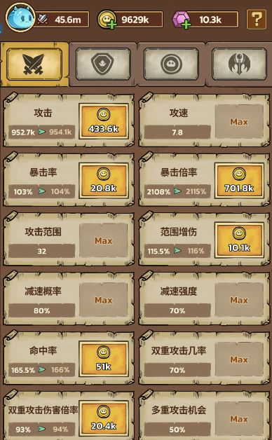 输出天赋优先点满攻速、攻击范围、多重 / 溅射目标数、双重 / 多重攻击几率、溅射几率、晕眩 / 击退几率。暴击率点到 120% 即可,全程主点攻击、暴击倍率。第八章补满双重 / 溅射伤害倍率,应对怪海压力。命中率、重伤按需点,范围增伤、眩晕时间、致命一击优先级低,留到后期。