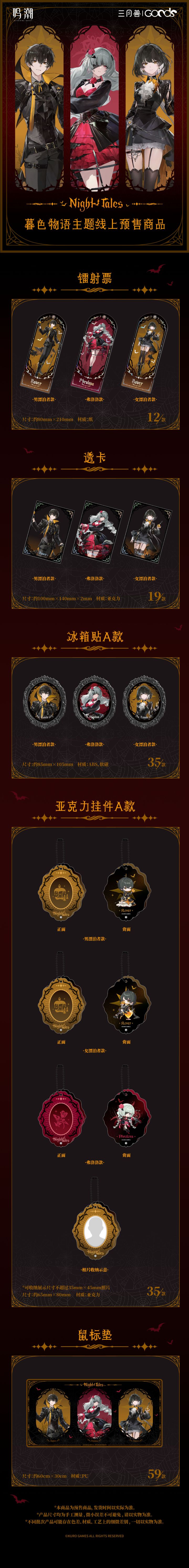 《鸣潮》与三月兽合作的“暮色物语”系列周边今日正式开启预售。本次上新涵盖多款品类,包括马口铁徽章、徽章套组、拍立得套组、色纸、立牌、镭射票、透卡、冰箱贴、挂件、鼠标垫等。