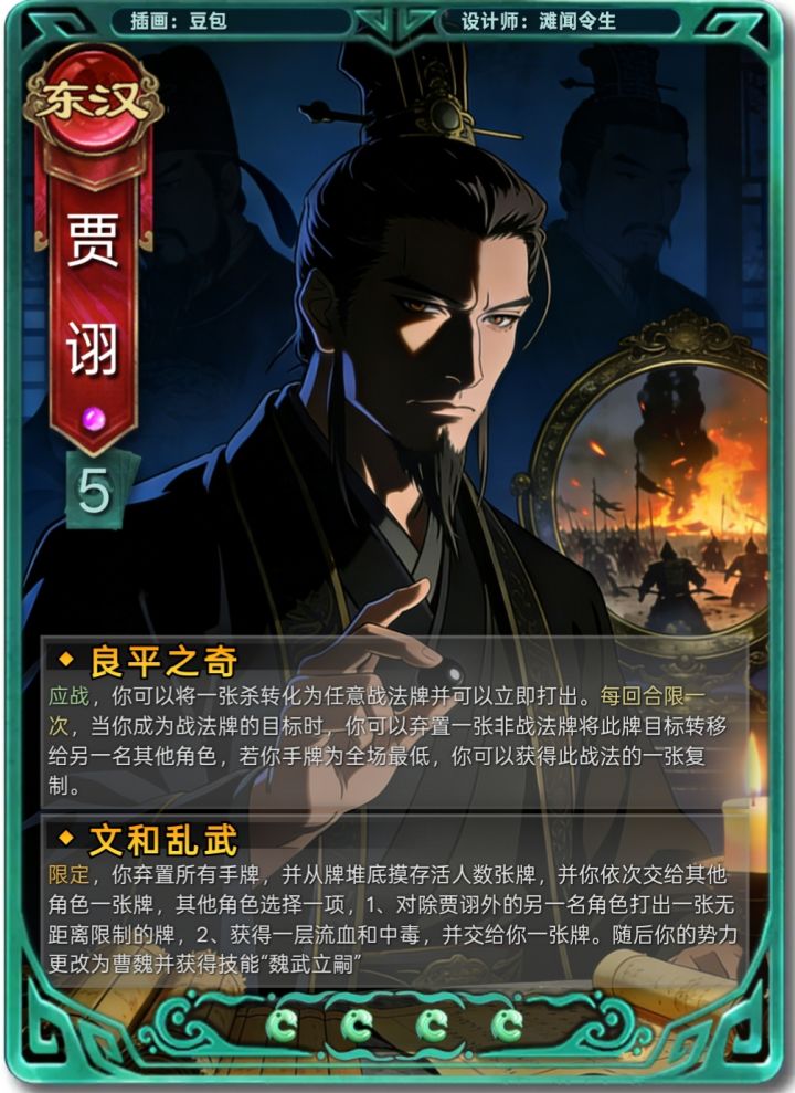 思路:《三国志》载其言:“闻长安中议欲尽诛凉州人……不如率众而西,所在收兵以攻长安,为董公报仇。”史称“文和乱武”。弃牌从牌底堆摸牌,反映绝境时放手一搏,谋策出奇的特点,分牌体现“乱中散财、全场布局、引动纷争”的操盘感,二选一:出牌或者获得流血+中毒+交牌——让人强制卷入,让局势大乱,最后改变势力曹魏意指后续贾诩归顺曹操。