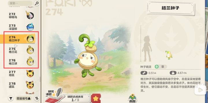 格兰种子16级进化成格兰花,格兰花32级进化成格兰球,格兰种子为S1赛季限定异色精灵之一。图鉴编号274-276。