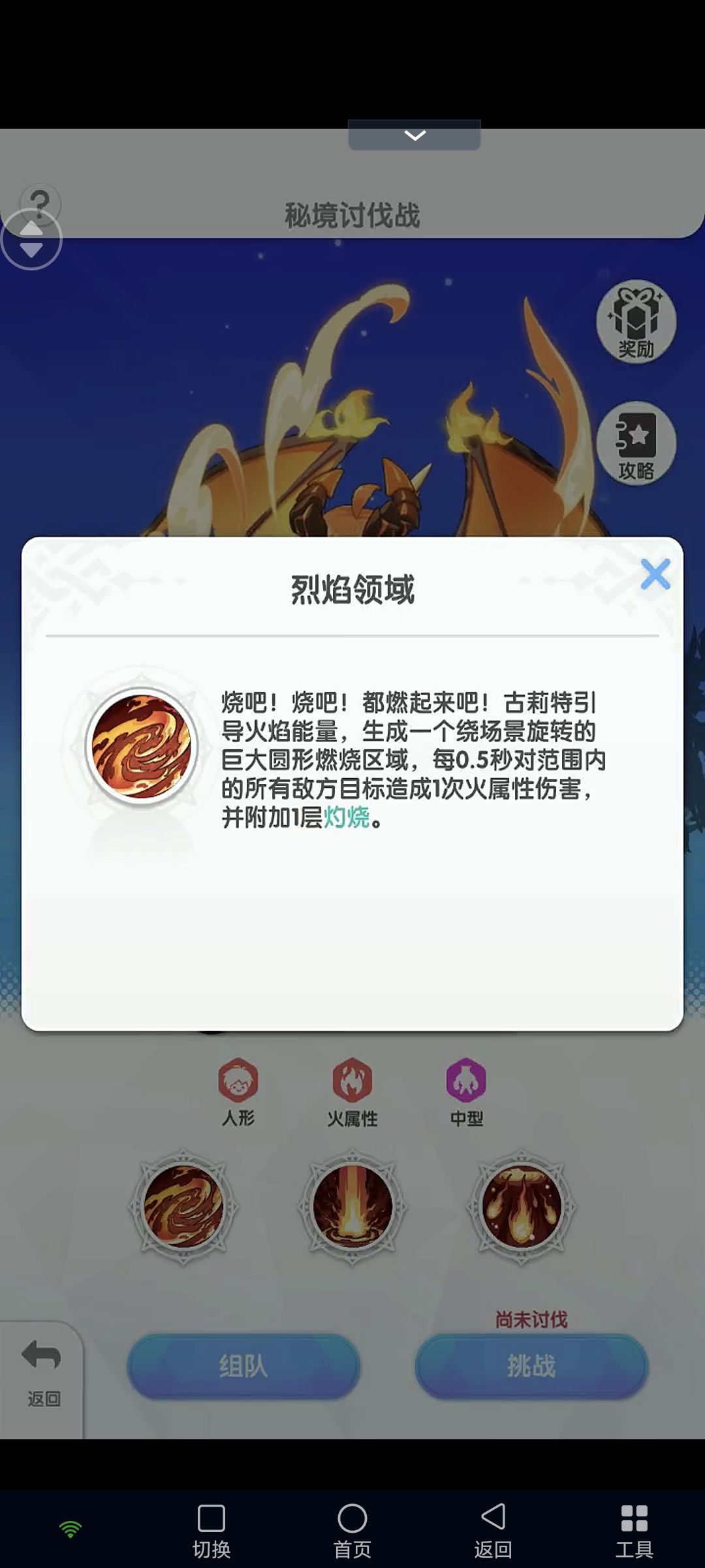 开局火精灵会开启烈焰领域,领域会覆盖半个场地,站在烈焰领域内会持续叠加自身燃烧层数,燃烧效果会持续掉血,烈焰领域有个小技巧可以卡掉,火精灵扔两个火团的时候带进烈焰领域可以把烈焰领域砸没。