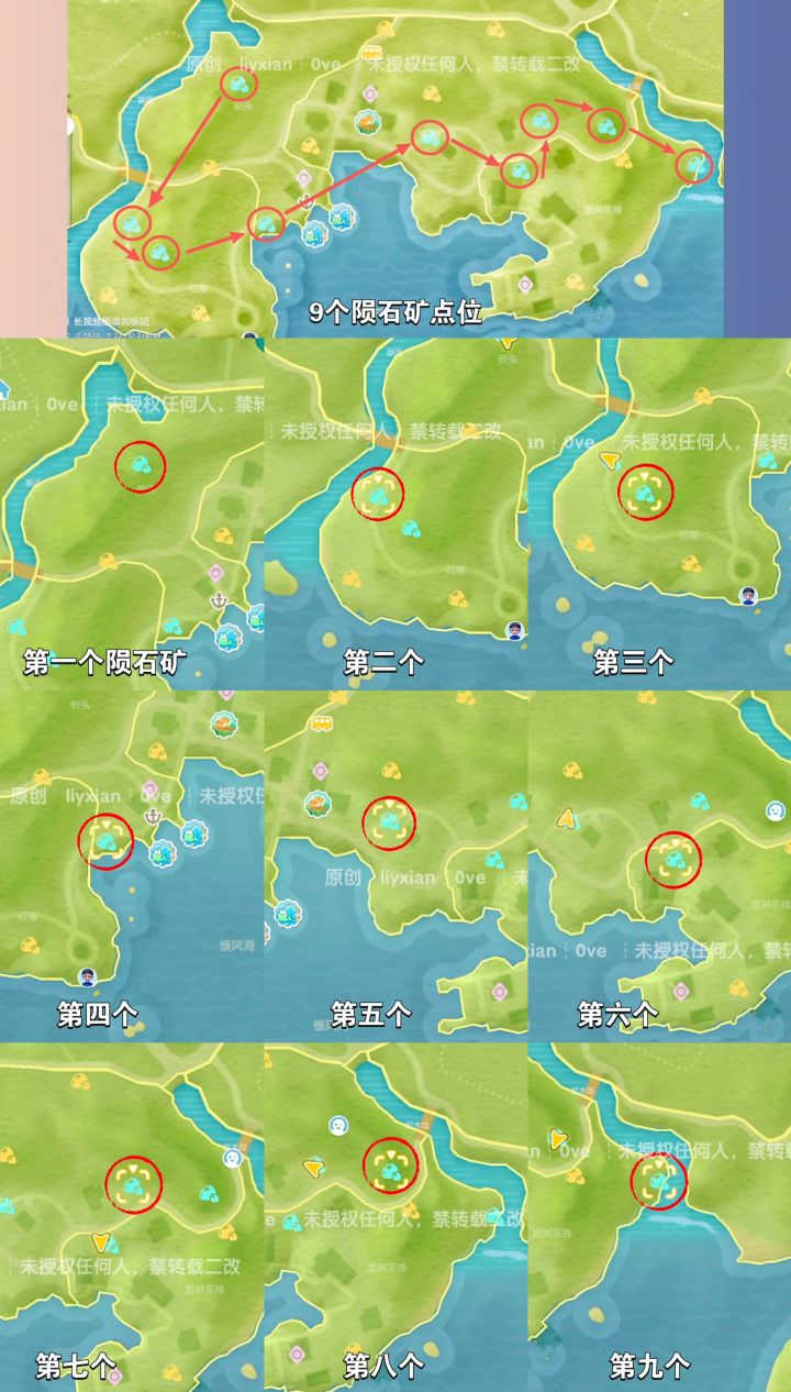 今天9个星陨碎片陨石矿 点位如图,一共有三个颜色的星陨碎片,每个颜色3个点位,共9个需要采集。
