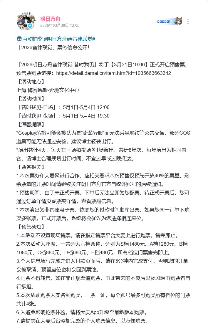 🎵明日方舟音律联觉预售明日开启,昔时我见定档五一上海 梅赛德斯-奔驰文化中心