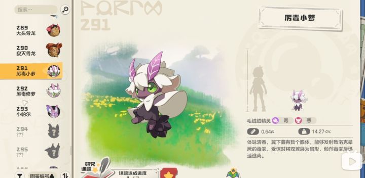 厉毒小萝40级进化成厉毒修萝。到点位后点击智慧树苗获取厉毒小萝精灵果实,需要洛克里安图鉴140,然后把果实放进眠枭庇护所就能在周围捕捉厉毒小萝。图鉴标号291-292。