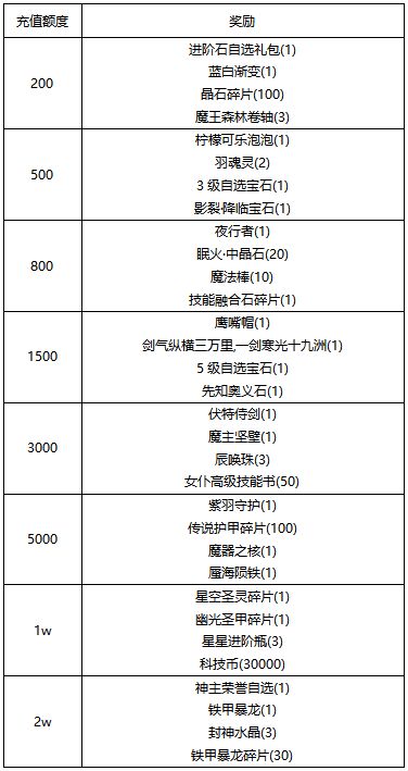 奖励说明:充值达到对应金额,即可领取该档位及以下所有奖励