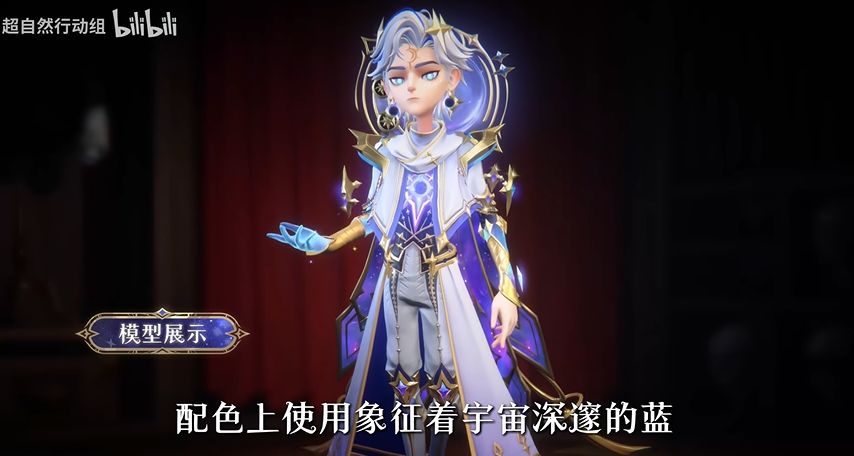 该时装以深邃宇宙为核心灵感,主色调采用象征星空奥秘的幽蓝与代表神圣秩序的鎏金,再以纯白细节点缀其间,层次分明又极具高级感。整体造型威严大气,将星际法则的磅礴与神秘完美融合,视觉冲击力拉满,尽显耀世品质的独特魅力。