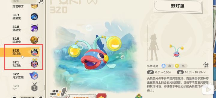 双灯鱼30级进化成利灯鱼。双灯鱼是赛季奇遇精灵,需要通过连续捕捉精灵后才会出现的特定精灵,且有异色形态。也可以在代币商店购买珍贵奇遇精灵蛋进行兑换。图鉴编号320-321。