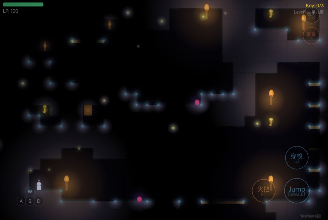 这么做之后,即使在远离火把的暗区,玩家也能通过微弱的轮廓光隐约感知地形,通过紫色幽光感知附近有敌人,通过金色微光发现钥匙——信息都通过光来传递,和游戏"觅光"的主题完美契合。
