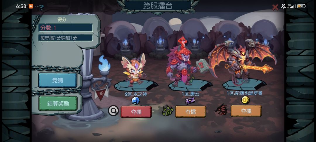 不要觉得自己没魔神打不了,事实上哪怕是家门鼠,也可以帮你赚几百钻石。擂台的特点是第一次进攻擂主,擂主是200%属性,然后每次擂主被打后,会减少20%全属性,所以可以先用一些废物进阶2,去摸擂主,把属性降低到80%以下,就能直接上台了。如果这时候没人打,你每占领一分钟,就能多30钻石!!