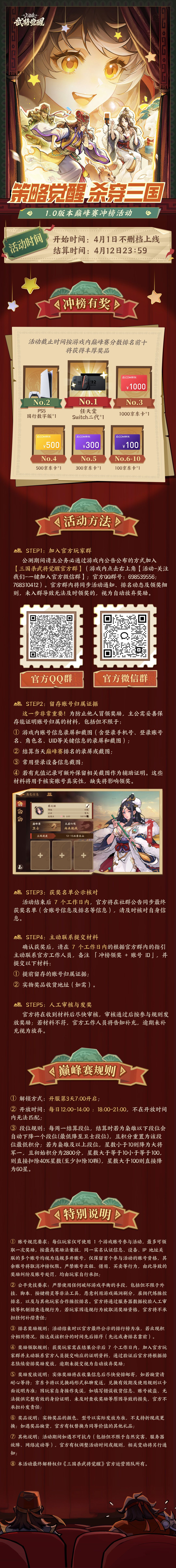 4月12日23:59分结算后,全服排名前十的主公都有好礼赠送,全服排名第一的主公将获得大奖Switch二代一台,第二名将获得PS5数字版一台!