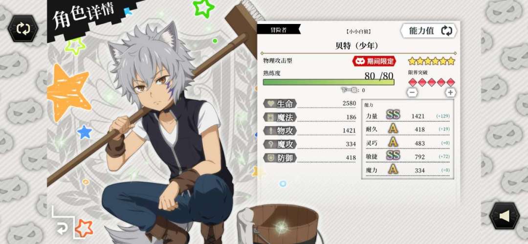 必杀技也是完美属性的超强威力全体攻击与少年贝特一致,常规输出技能则是强威力的单体爆发,这两个技能都是发动时提高力量,同样不用担心敌人的驱散效果。