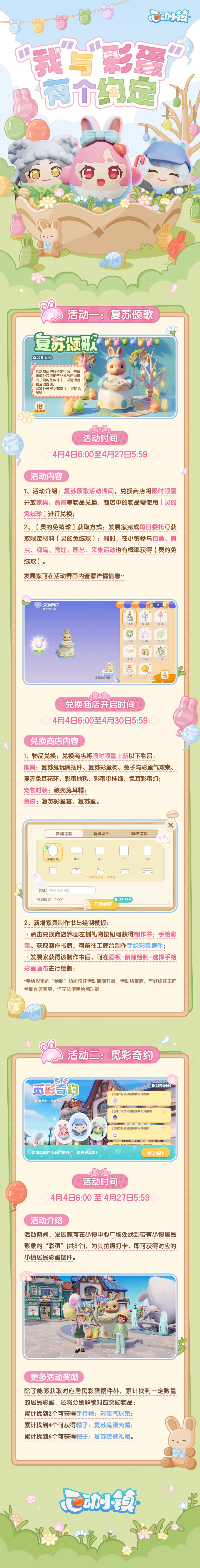 活动内容:活动期间,小镇中心广场附近散落了8个小镇居民形象的“彩蛋”。发展家找到彩蛋摆件并为其拍照,即可获得对应的居民彩蛋摆件。(活动开启第一天解锁4个“彩蛋”,第二天解锁4个“彩蛋”)