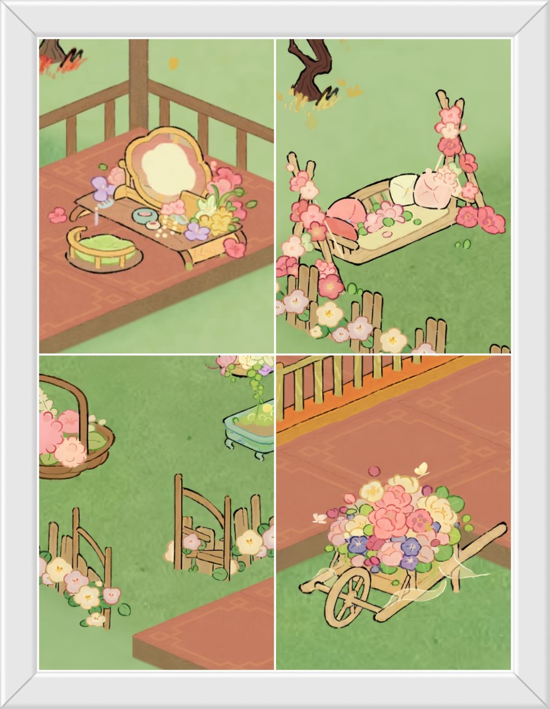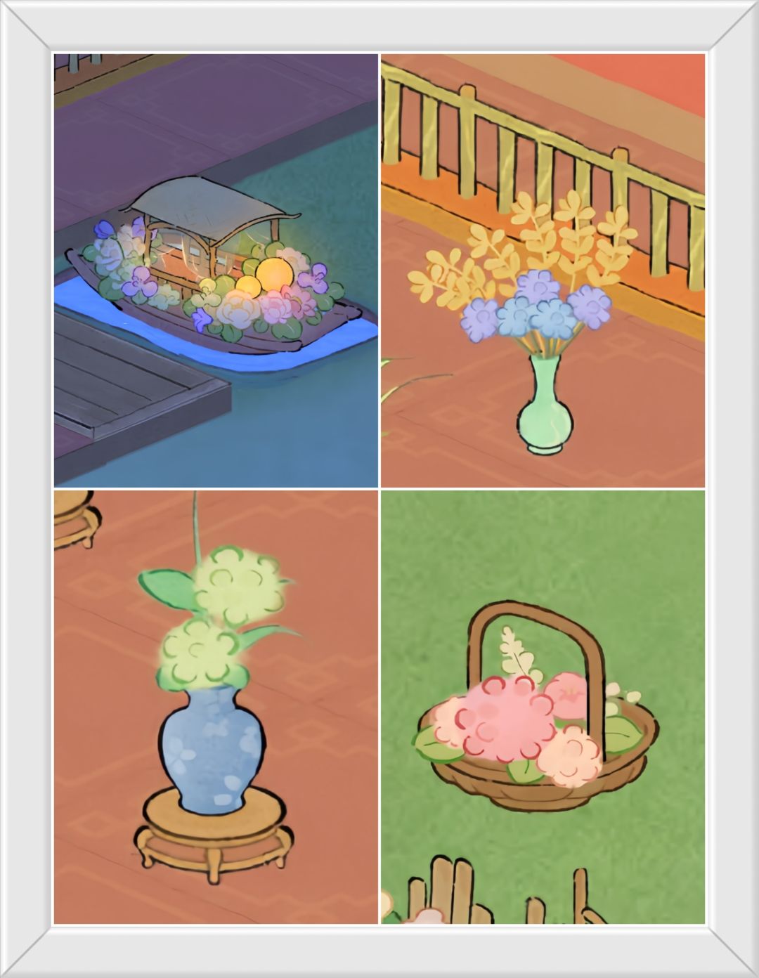 2:市珍建筑:花柵栏、晚拥报西、芬妍满舟、芳音佳接、芳轼香繳、摇撮冰芳、扰艳激香、花璃灯、簇花扇、花珊栏、聚花篮。