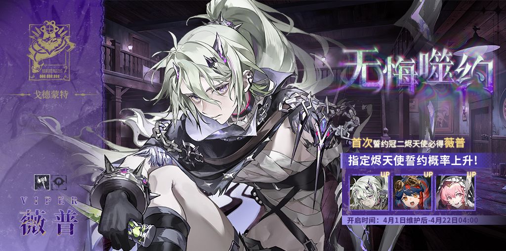 誓约说明:活动期间【无悔噬约】限时誓约开启,该誓约中以下烬天使获得概率提升: