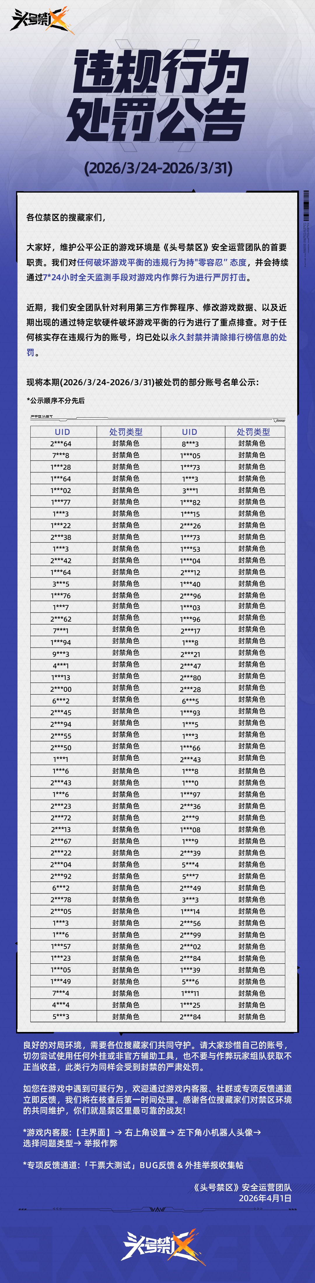 《头号禁区》外挂作弊处罚公告(4月1日)