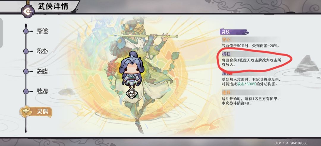 墨家巨子是赠送武侠,主要作用就是带一个有横扫词条的灵偶,让临渊龙王触发该词条,实现爆炸输出,下面会给到灵偶词条图片。