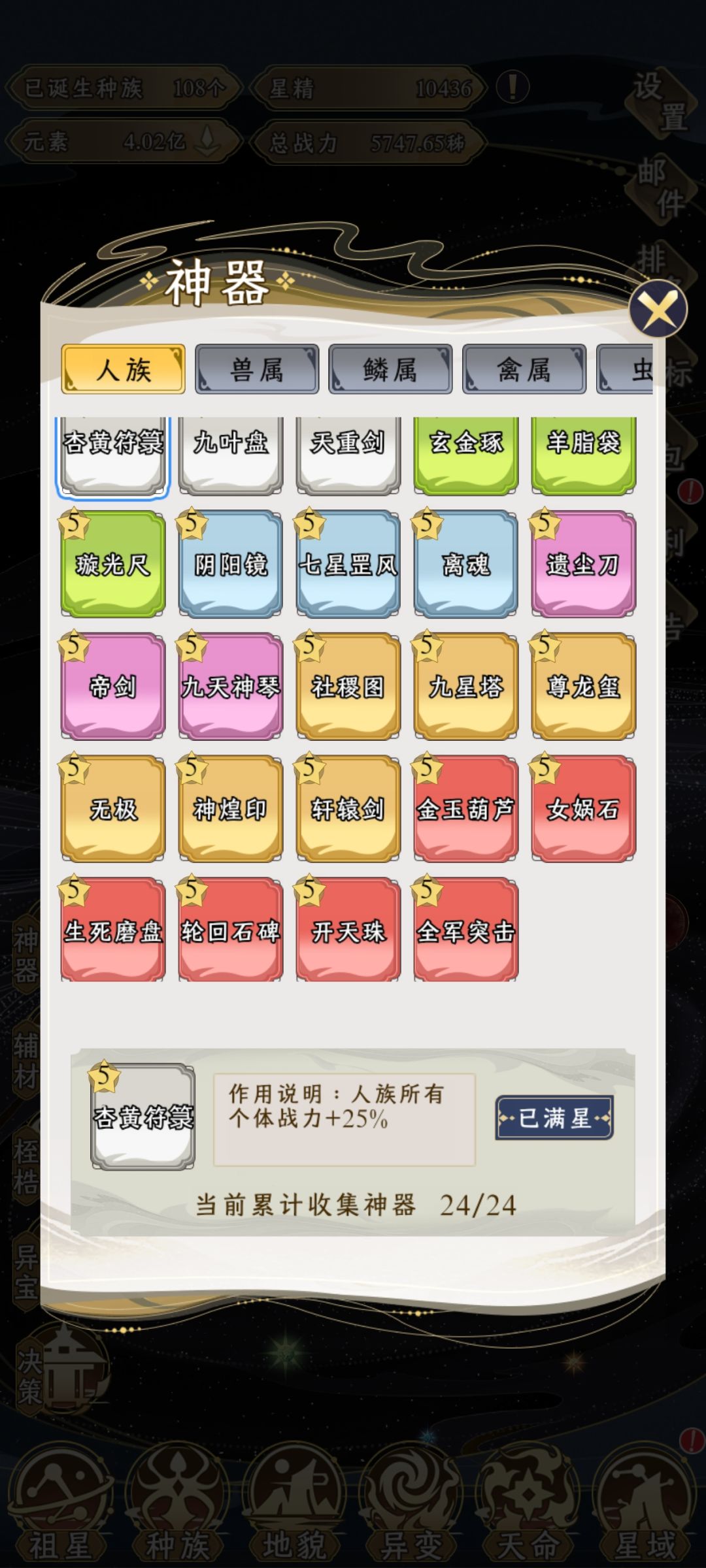 记录一下,神器20个种族挂机2天才满.辅材种族全满,剩下道法跟血统懒得刷了.