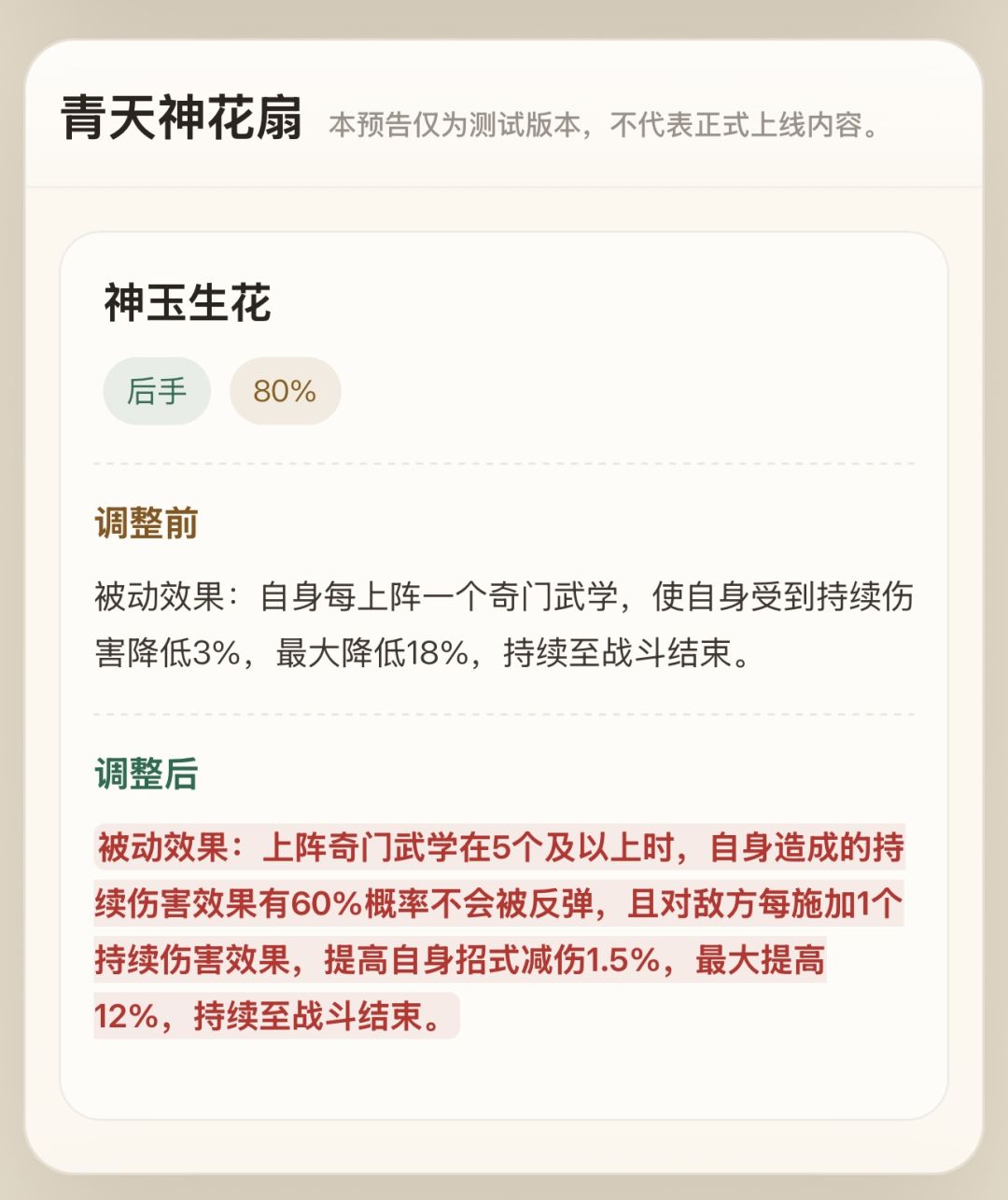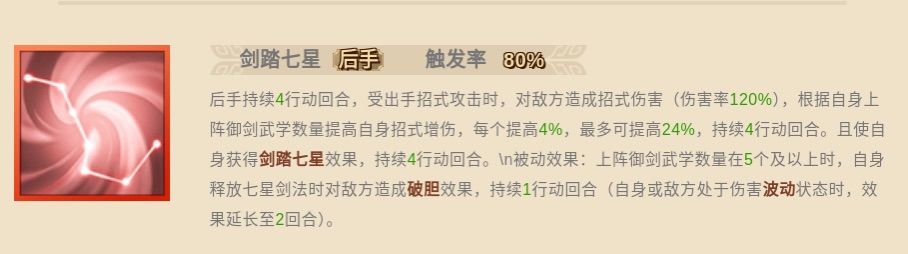 被动效果:上阵奇门武学在5个及以上时,自身造成的持续伤害效果有60%概率不会被反弹,且对敌方每施加1个持续伤害效果,提高自身招式减伤1.5%,最大提高12%,持续至战斗结束。