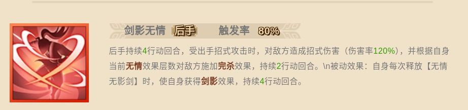 释放御剑武学时,触发连击、获得聚气值提升效果、造成霜寒或流血效果时获得1层无情效果,持续至剑影效果结束,每回合最大获得2层。若后手效果【剑影无情】回合结束时未被触发,则降低敌方实战减伤20%,持续2行动回合。