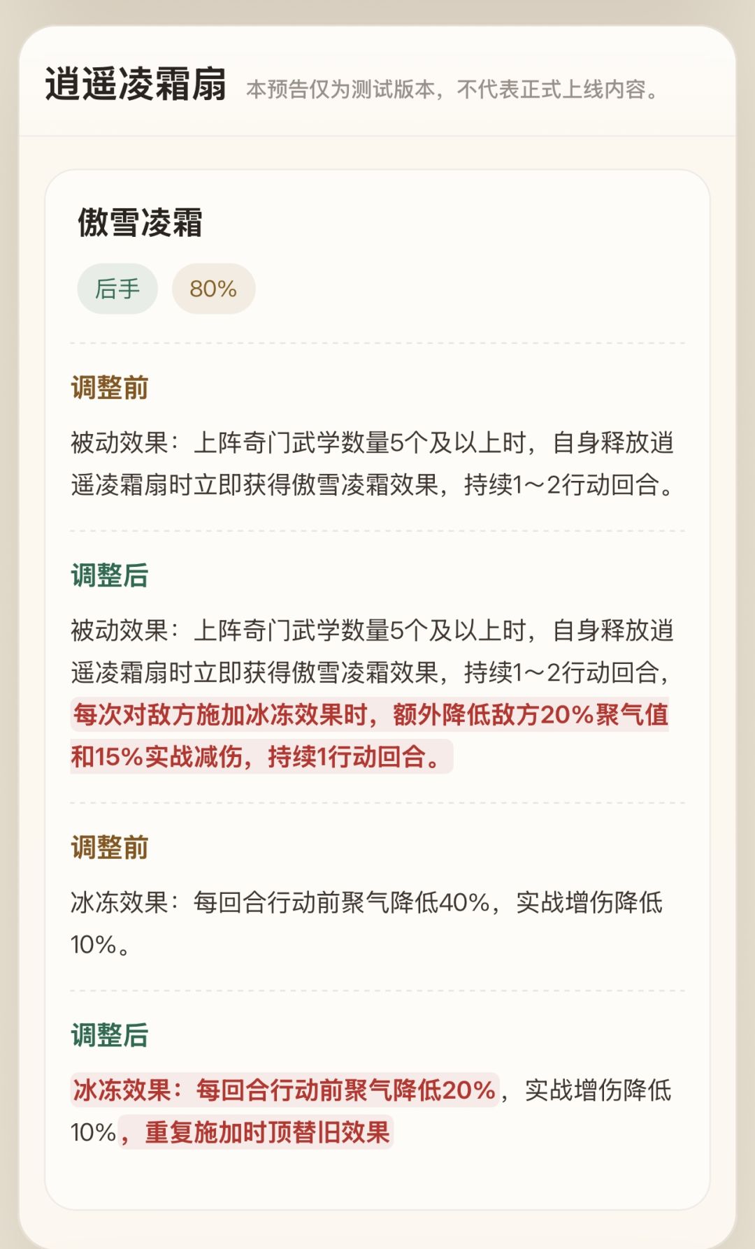 冰冻效果:每回合行动前聚气降低20%,实战增伤降低10%,重复施加时顶替旧效果