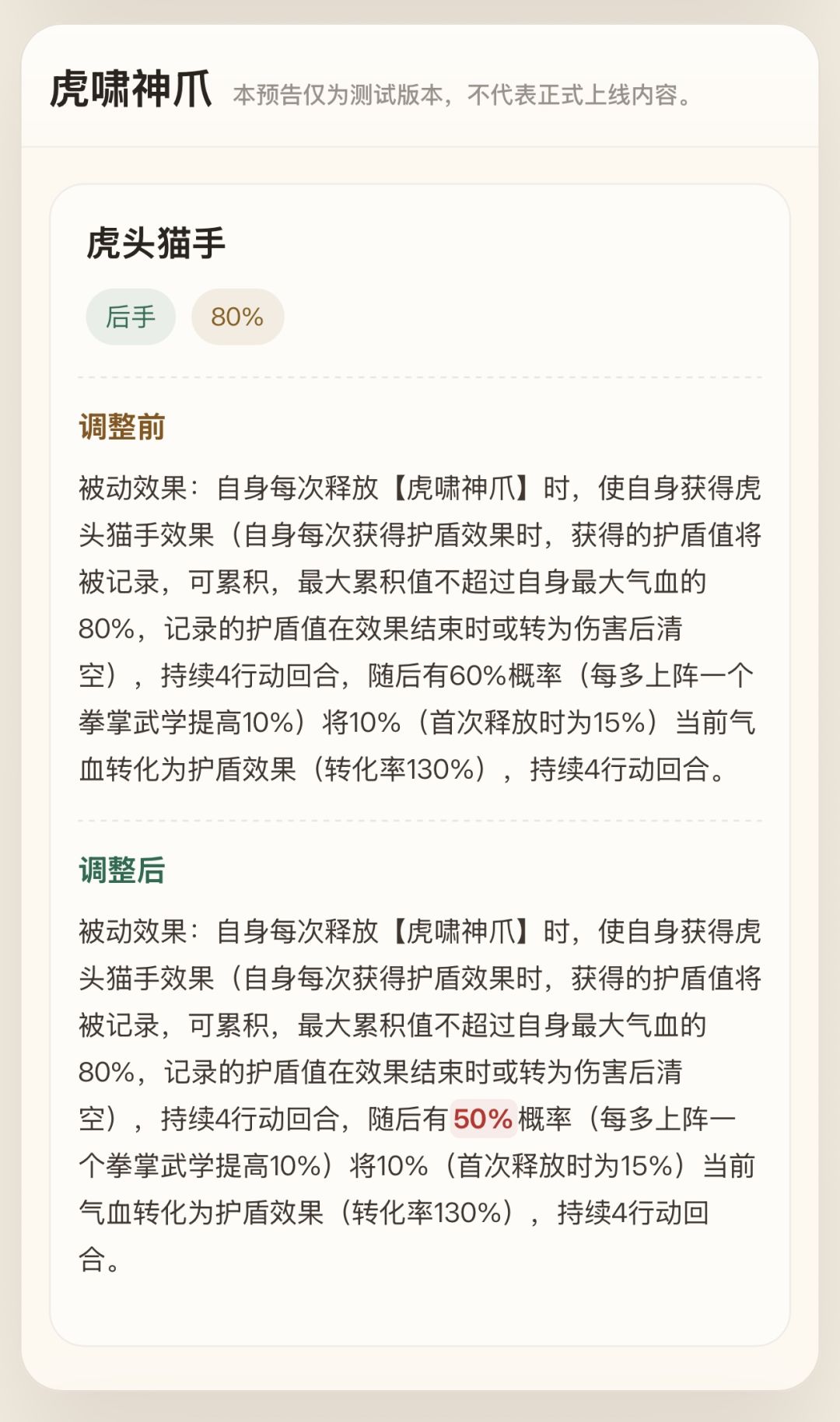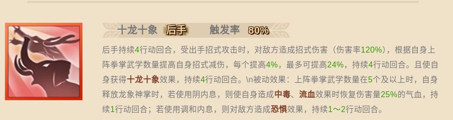 被动效果:自身每次释放【虎啸神爪】时,使自身获得虎头猫手效果,持续4行动回合,随后有50%概率(每多上阵一个拳掌武学提高10%)将10%(首次释放时为15%)当前气血转化为护盾效果(转化率130%),持续4行动回合。