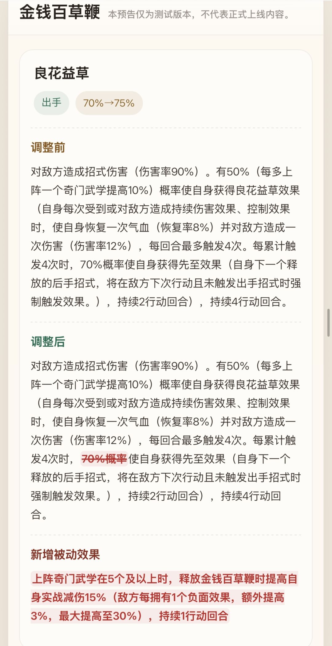 上阵奇门武学在5个及以上时,释放金钱百草鞭时提高自身实战减伤15%(敌方每拥有1个负面效果,额外提高3%,最大提高至30%),持续1行动回合