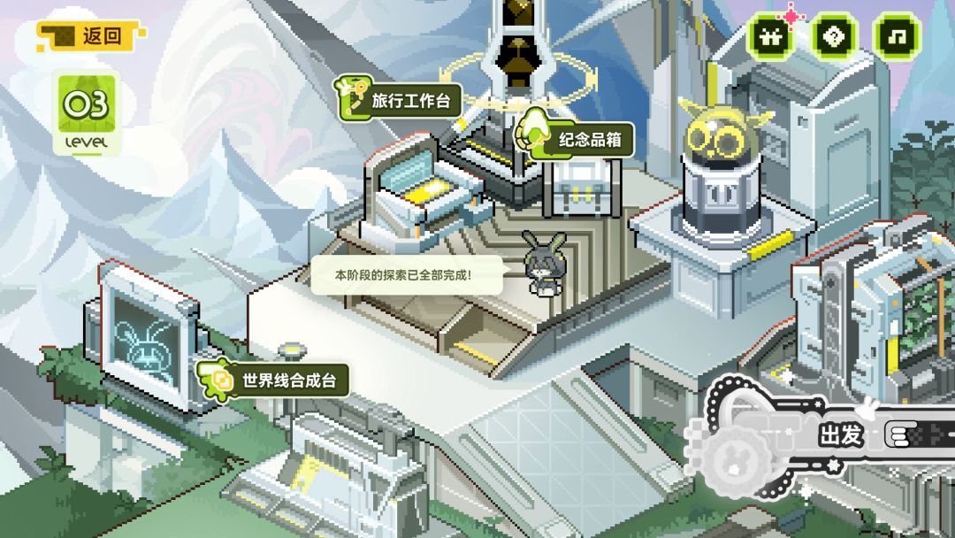 此时会提示本阶段探索已经全部完成,点击世界线合成台,随便找点合成,我选择了以上几个合成。获得了绽放图鉴,之后去旅行工作台点击回溯,再点主界面的出发,把之前没收集到的道具全收集。