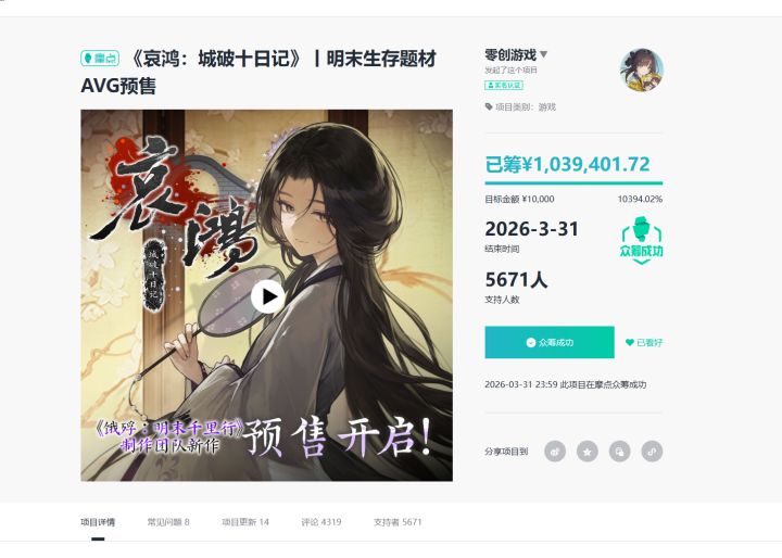 📖《哀鸿城破十日记》预售正式结束,近万人、超百万众筹表现支持创国产AVG佳绩