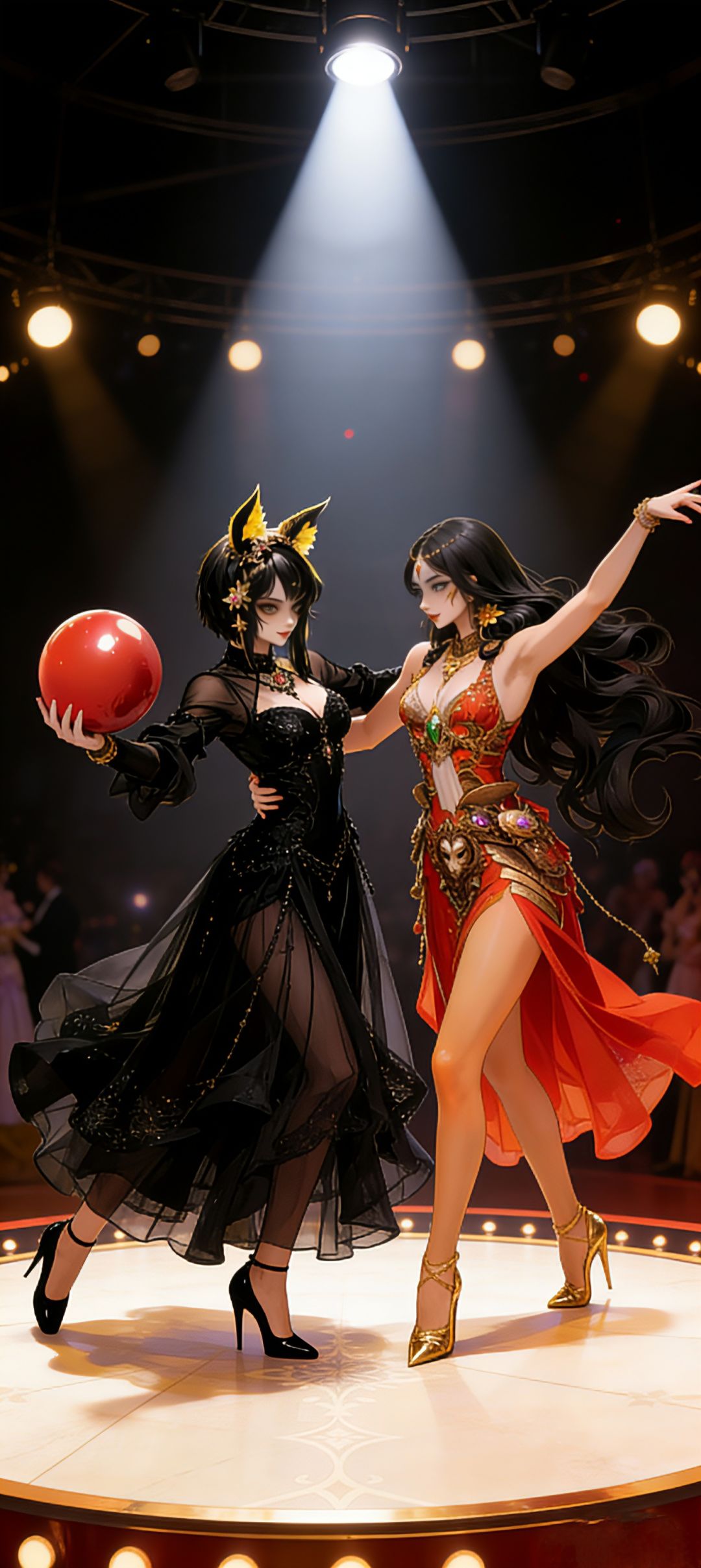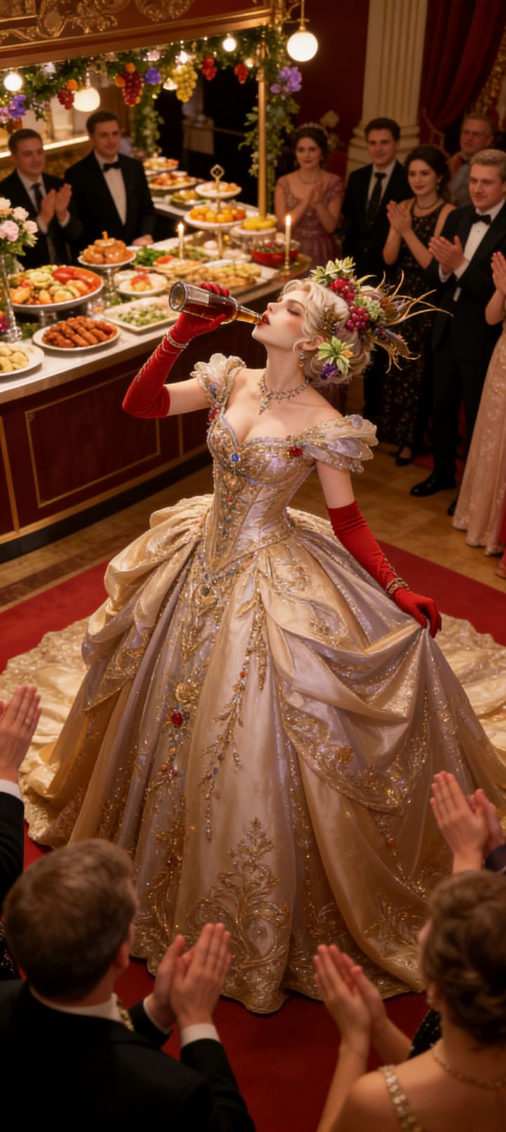 涅墨西斯和海拉不喜吵闹出来放风,酒神依然痴迷饮酒,在众人的起哄下表演对瓶吹,我们可怜的小雨神被酒神拉去喝酒,结果喝醉了,提前到楼上客房休息,两个热爱优雅的人士芭丝特和塞赫迈特登上舞台优雅起舞。台下交谊舞的人群中我们舞神大人麦尔特正在跳一曲热情的拉丁。2楼的人群中,斯卡蒂和荷拉德古纳穿着华丽的礼服,靠着栏杆边交谈边望着楼下热闹的人群,赫拉和她的姐妹团依然优雅的吃着下午茶进行一些八卦的交流,我们伟大的作家菲尼克斯来到城堡后院和锦鲤们玩耍以获得灵感,塞尔凯特和厄里斯觉得很无聊,相约去打牌玩