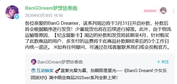 官方发布公告称简中限定商品系列的纪念留影卡周边补款和发货将延期至4月