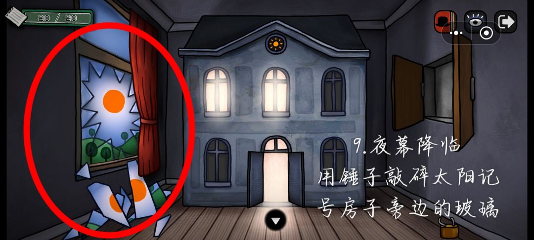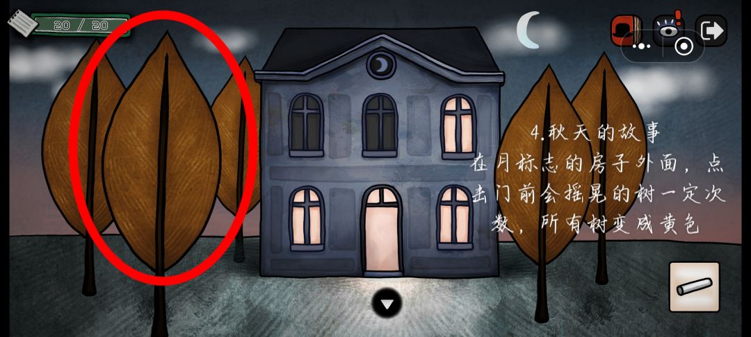在月亮标志的房子外面,点击门前的树(会摇晃)一定次数,所有树会变成黄色