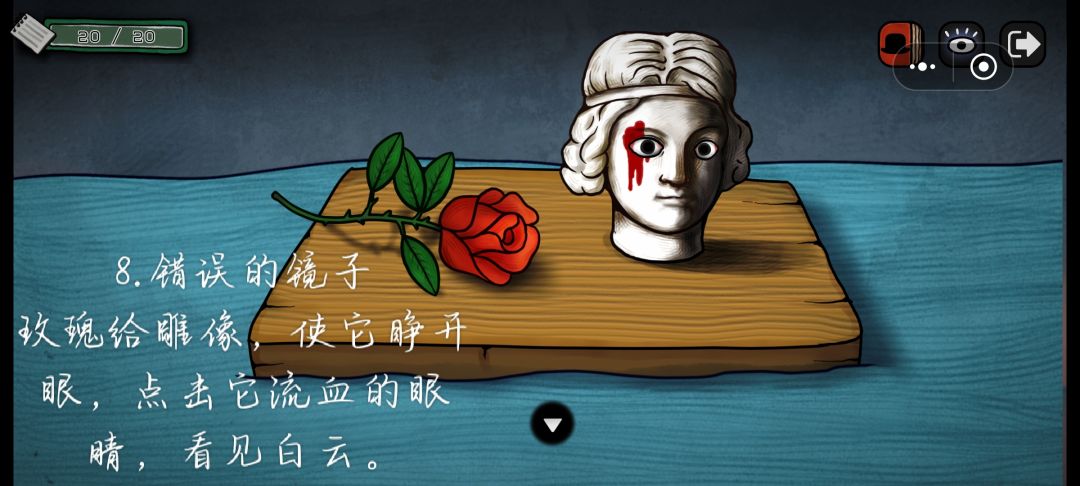 玫瑰给海上雕像,使它睁开眼,点击它流血的眼睛,看见白云。