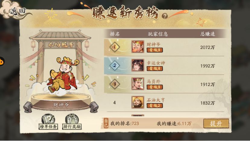大家最先接触到的榜单是赚速新秀榜。该榜单持续3天,根据时旅者们的实时赚速进行排名,鼓励大家提升店铺赚速,通过排名竞赛的形式,从不同维度推动经营成长。