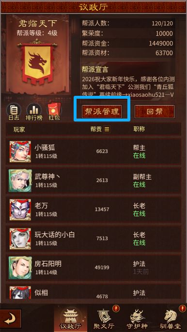 在议政厅中,有职位者可进行帮派管理,无职位者则可在(下图蓝框)处退出帮派。