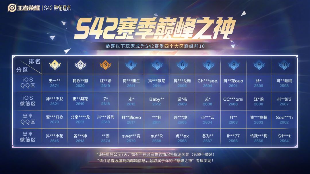 荣耀加冕!《王者荣耀》S42赛季巅峰赛前10玩家诞生 玩家齐送祝贺