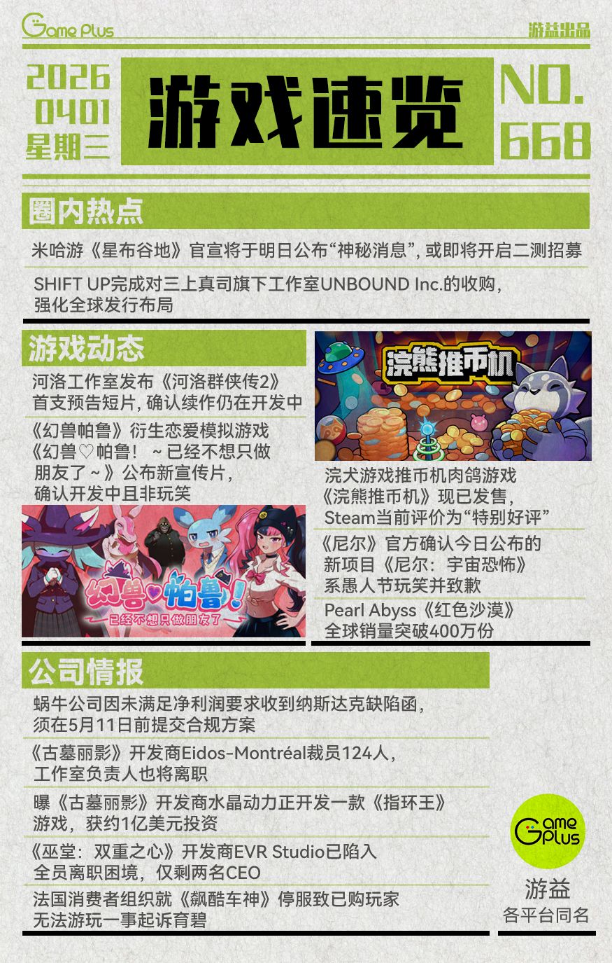 《胜利女神:妮姬》《剑星》开发商SHIFT UP宣布完成对日本工作室 UNBOUND Inc.的全资收购。据悉,UNBOUND由知名制作人三上真司担任CEO,正开发面向全球市场的原创IP。SHIFT UP表示将承接其发行业务,逐步构建全球服务体系。