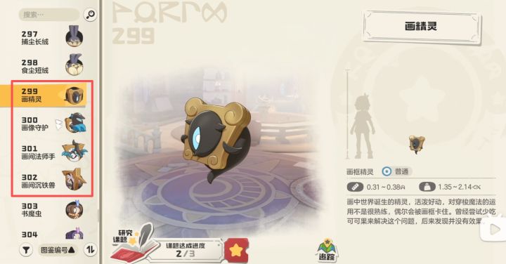 画精灵16级进化成画像守护,画像守护36级且击败3只武系精灵(推荐打小怂猫家族)进化成画间法师手,画像守护36级且击败3只幻系精灵进化成画间沉铁兽。来到魔法学院生态广场后进入生态社, 然后跟着图示走,把墙上的画都点了,就能拿到画精灵。图鉴编号299-302。
