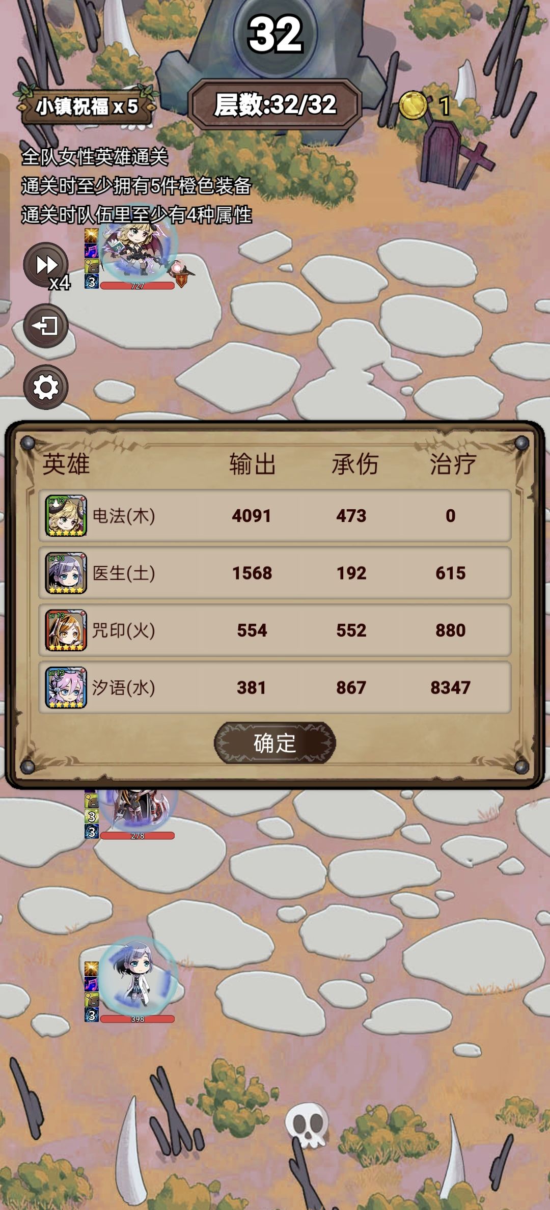 困难5也不难,主要注意买橙色装备,还有英雄的四种属性跟女性这个条件。26层是冰剑,输出不够,8回合会召唤两个怪。boss如图