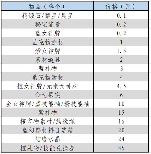 每个礼包都会标注一个“超值”XXX%,其中的XXX%通常可以近似地看作礼包的“性价比”。这个数字由物品的官方定价和礼包售价共同决定,计算方式为物品总价值/售价*100%。常见物品的官方定价如下:
