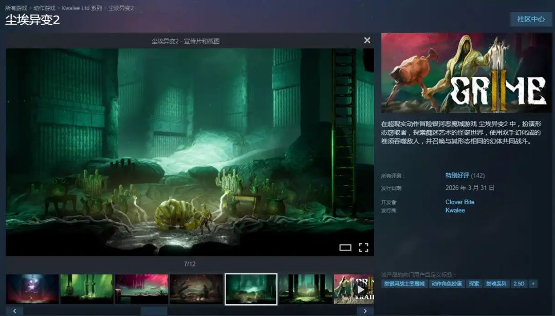 不过在2021年,《尘埃异变》(《GRIME》)却依靠极为扭曲的克系画风、类魂机制的战斗以及独具特色的武器形态变化和怪物吸收玩法在这个赛道上闯出了一条不一样的道路,也收获了大量的好评。 而时隔5年后,在各方面得到全面进化的续作《尘埃异变2》也已经全平台(除NS系列)发售,Steam版首发折后价为81.6元,与一代的捆绑包更有-35%的额外优惠。