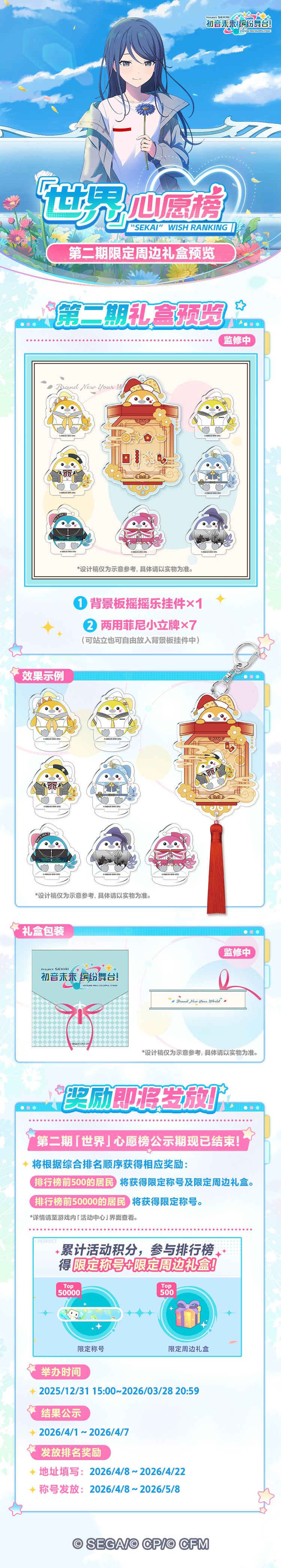此外,「世界」心愿榜(第三期)正在进行中,欢迎各位居民踊跃参与!活动结束后,将根据综合排名顺序获得相应奖励:排行榜前500的居民将获得限定称号及限定周边礼盒;前50000的居民将获得限定称号。